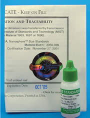 納米級微球顆粒標(biāo)準(zhǔn)品(Particle-Size Standards)直徑大小高度均一,具有NBS 的NIST認(rèn)證,屬于Duke Scientific公司榮譽(yù)出品Nanosphere Size Standards™系列產(chǎn)品中的聚合體微球標(biāo)準(zhǔn)品(苯乙烯單體聚合而成)。