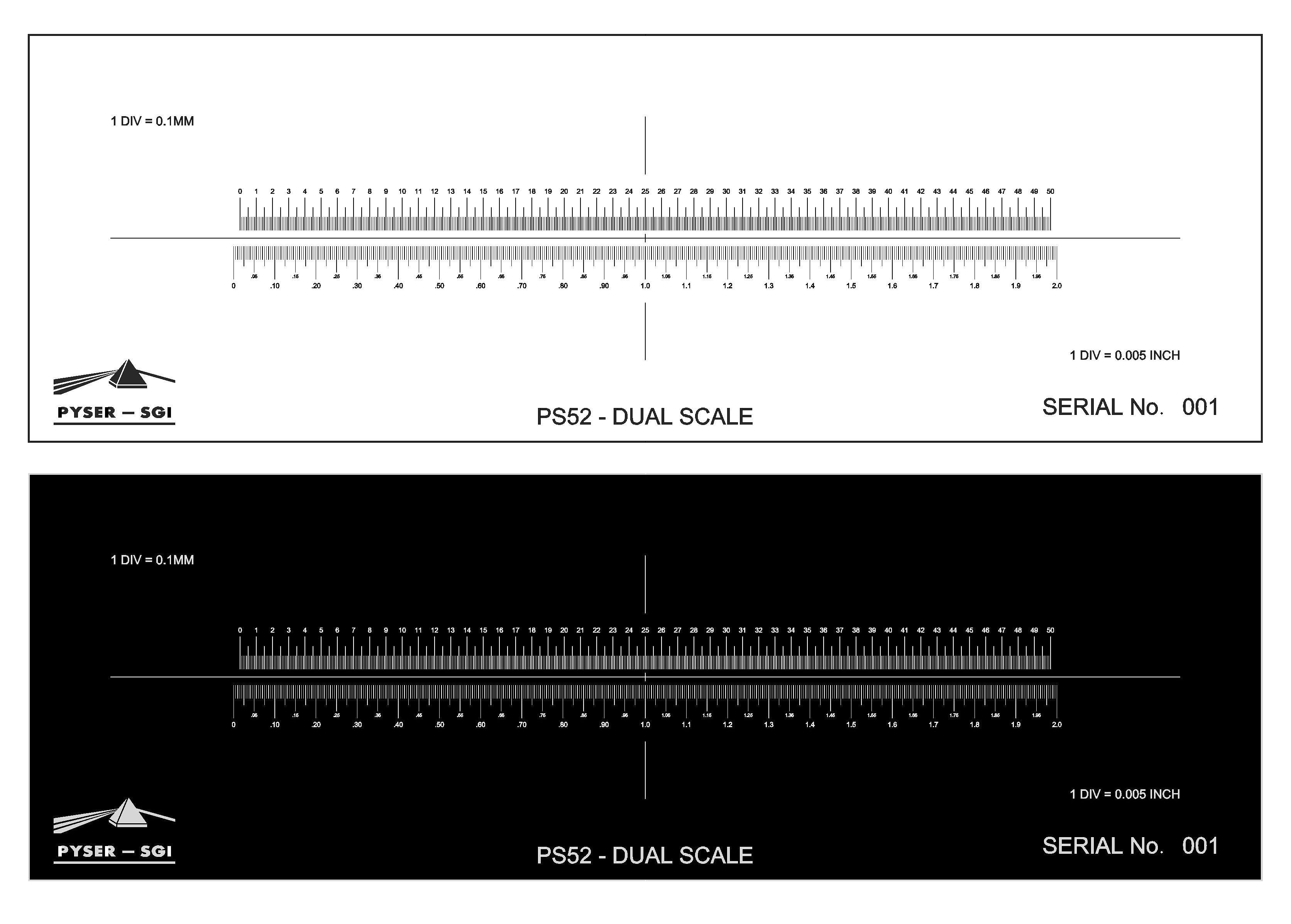 主要用于透射光照明的體視解剖顯微鏡,特別適合大視野范圍的操作或者拍照使用。標(biāo)準(zhǔn)的載玻片的外形,具有唯一產(chǎn)品序列編號(hào)可供追溯。同一玻璃尺刻度有英制和公制,正片(positive versions)和負(fù)片(negative versions)兩種便于客戶的選擇。產(chǎn)品的示意圖如下: