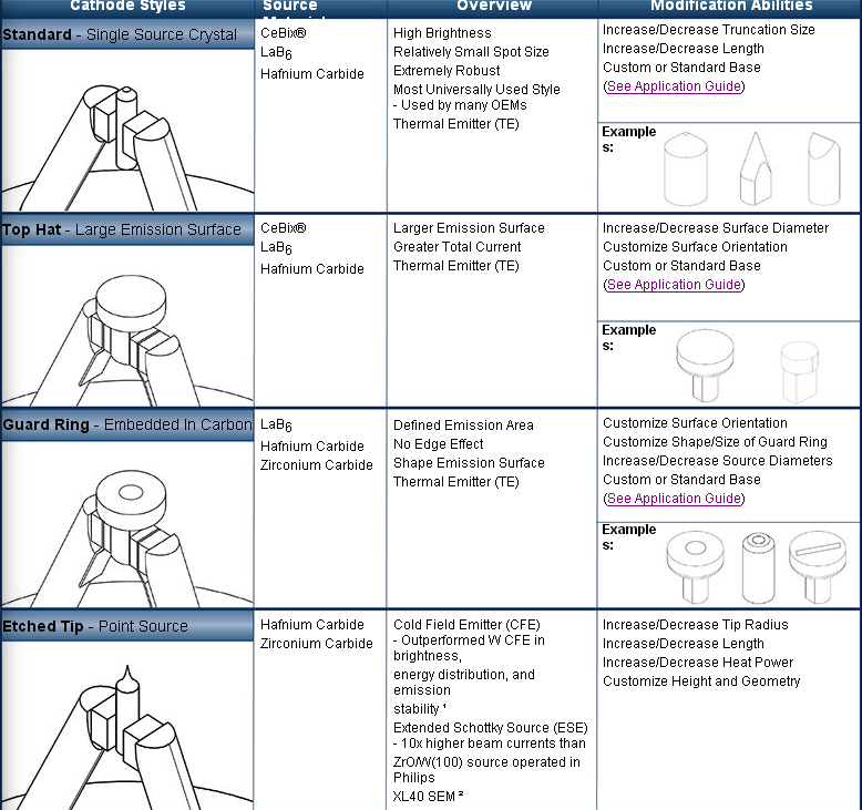APTECH公司帶給大家四種常見材料的的電子發(fā)射源。熱游離發(fā)射thermal emission (TE)源有六硼化鑭(LaB6)和六硼化鈰(CeBix®)燈絲兩種;場(chǎng)發(fā)射電子槍有兩種:冷場(chǎng)發(fā)射式(cold field emission , FE),熱場(chǎng)發(fā)射式(thermal field emission ,TF),過(guò)渡金屬元素常作為場(chǎng)發(fā)射材料,而難熔金屬往往作為冷場(chǎng)發(fā)射源。