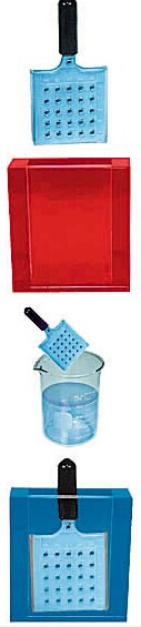 套裝包含:一個(gè)25孔彈性塑料染色板(the matrix with handle),一個(gè)染色板蓋子(cover),2個(gè)染色缸(staining vessel)。