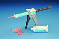 Sylgard 184硅橡膠(Kwik-Gard™Start Up kit)特別適合科學研究應用。可以省去混合兩種膠帶來的麻煩和時間的浪費。當推進注射器時自動在尖部混合,無任何氣泡,直接用于位點。更換尖端就可以重復使用,有效避免了浪費。每針筒含有37ml的硅膠樹脂和固化劑,針筒頭(tip)的體積0.75ml。針筒內(nèi)的硅橡膠是Sylgard 184,液體組分組成的雙組分產(chǎn)品,包括硅膠組分與固化劑。硅膠組分與固化劑按10:1重量比完全混合,形成中等粘度混合液,混合液將固化成為具有韌性的透明彈性體,硅橡膠在25℃的溫度固化需要24h,無放熱現(xiàn)象,無需二次固化。
