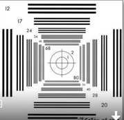 NBS 25分辨率測試靶又稱NBS 1952分辨率測試靶,圖形從外周向中間遞減,提供了24組線條,范圍為3線對每毫米到20線對每毫米。測試靶的中心有兩個同心圓和十字叉絲。三條線一組,盡可能降低亂真分辨率。