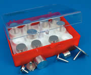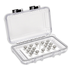 4.通用型銷釘型樣品臺盒:Pin mount storage box.。銷釘直徑為3.1mm的樣品臺均可以放置。里面有18個臺位(編碼1-18)??梢匝b18個臺面直徑12.7mm的;或8個臺面直徑25mm;或2個32mm;或2個38mm;或2個50mm。