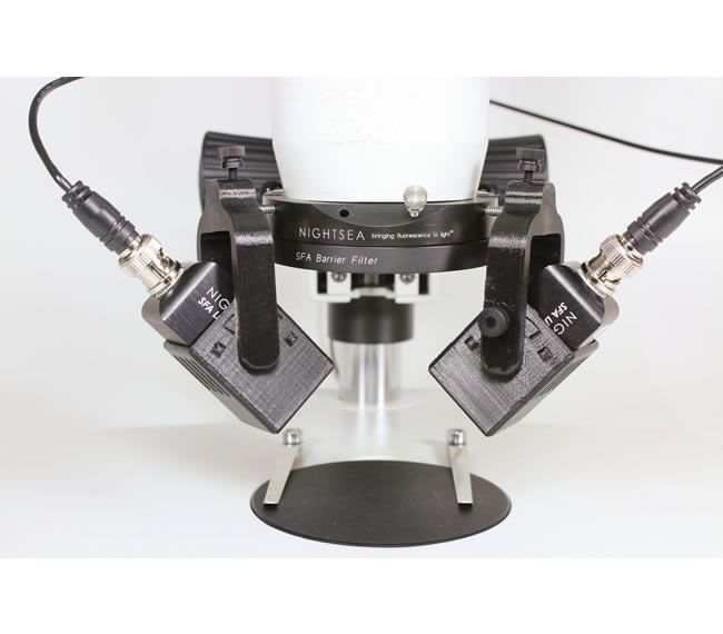 燈使用上可選的配件:燈頭吊架和電纜線。如果覺(jué)得鵝頸燈的角度滿足不了自己的需求,可以購(gòu)買吊架和電纜線,吊架可安裝到SFA適配圈上任何一個(gè)螺釘?shù)哪┒?。燈頭吊架有兩個(gè)不同的樞軸臂長(zhǎng)度,用于長(zhǎng)和短的工作距離。從鵝頸上移除燈頭,裝入吊架,并將其安裝在SFA適配圈上,用電纜線直接連接燈頭和燈座。其實(shí)可以一個(gè)燈座連接雙線電纜,安裝兩個(gè)燈頭和兩個(gè)吊架,你就有雙倍的激發(fā)強(qiáng)度。