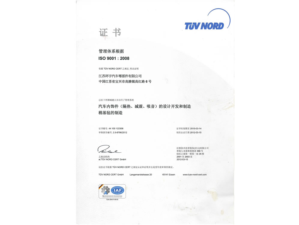 江蘇環宇汽車零部件有限公司成立于1997年的江蘇環宇汽車零部件有限公司,作為國內汽車隔音降噪產品的主要提供者之一,始終把技術、質量、安全和環保視為產品的核心價值,確保向客戶提供高品質的產品。公司于2004年通過了IS09001和ISO/TS16949認證,2011年通過ISO14001。